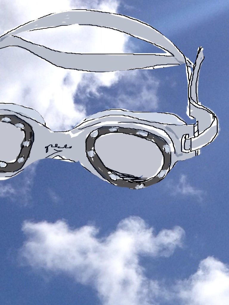 I comment on forgetting my goggles and the lifeguard offers a box of goggles I can borrow. As I begin to look, the woman offers me her goggles which she explains are brand newish. Most of the ones in the box are broken at the nose. Before I know if all of them are broken, I put the guard box down and accept the pink woman’s goggles. The strap is the thinnest I’ve ever seen. It is made of linguini shaped translucent off white plastic with sparkles.
