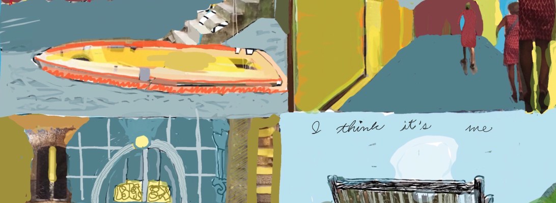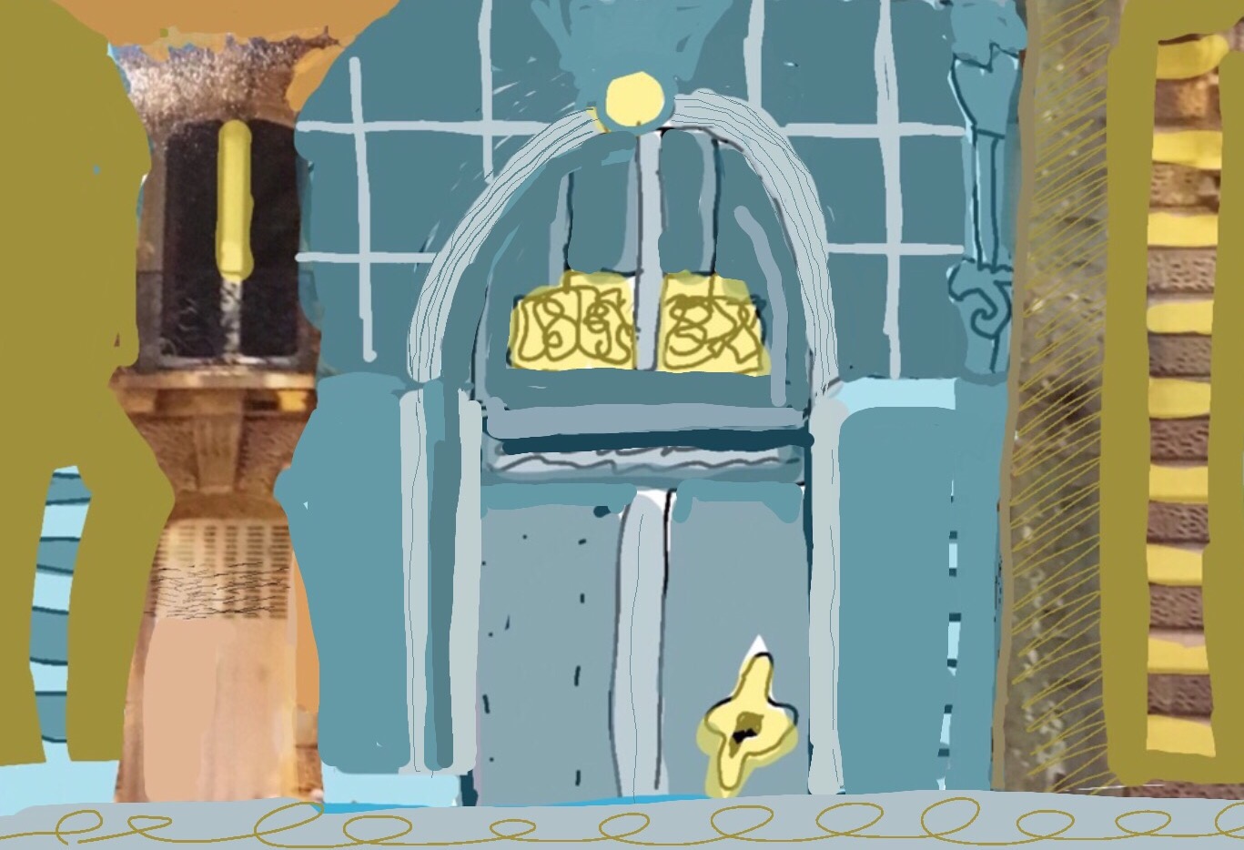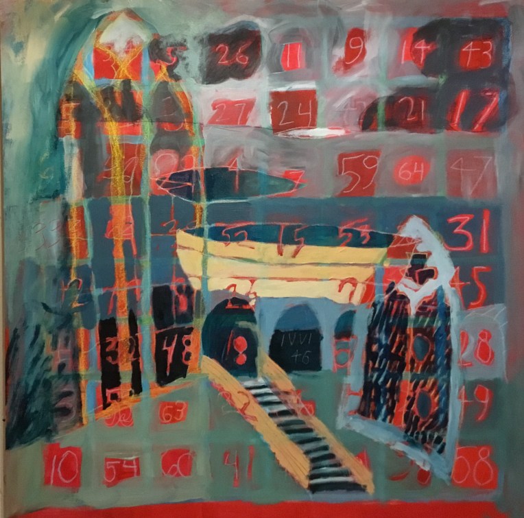 Which is what inspired this painting. Boats ready not to take him to the other shore. Amidst portals to the other side. The I Ching chart of life’s changes in the background.