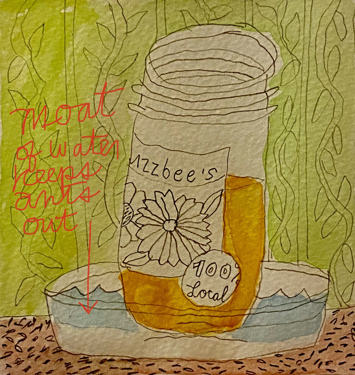 On with the story. Because of the rain, this morning I arrive at my kitchen counter to find hundreds (at least) of ants scurrying around the honey jar. it is closed (thank god for something) but they are all over it. Without thinking, I pick up the jar and wash it off, killing a few score ants in the process. I open the honey and am glad to find none inside. I do all this automatically because my mind’s focus is on one one thing: my coveted morning black tea.