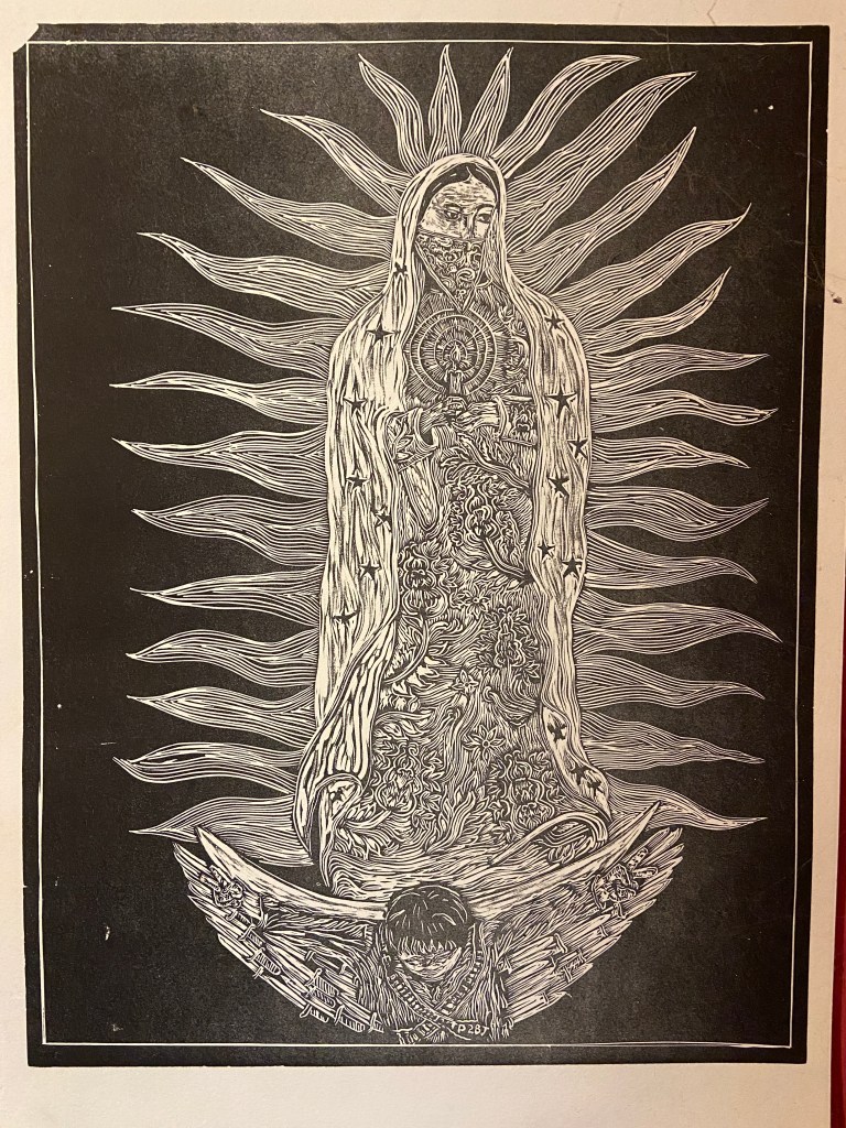 Lithograph from kitchen linoleum by a Mexican Artist in the Mission SF from 2012 Levis print workshop on Valencia St